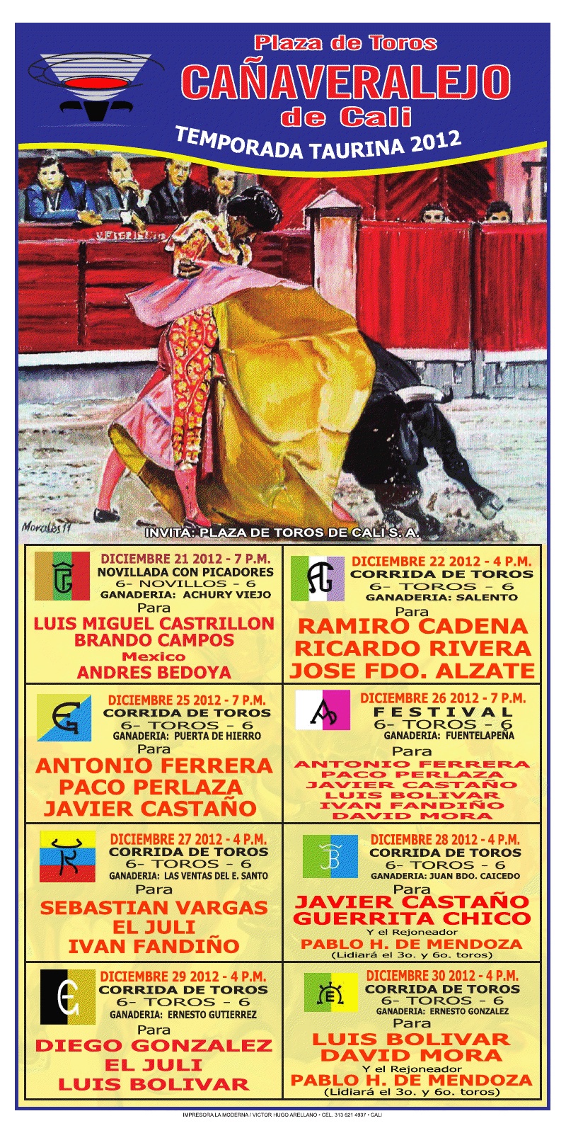 Viernes, 21 de diciembre: A las 7:00 PM. Novillos de Achury Viejo para Luis Miguel Castrillon, Brandos Campos y Andres Bedoya